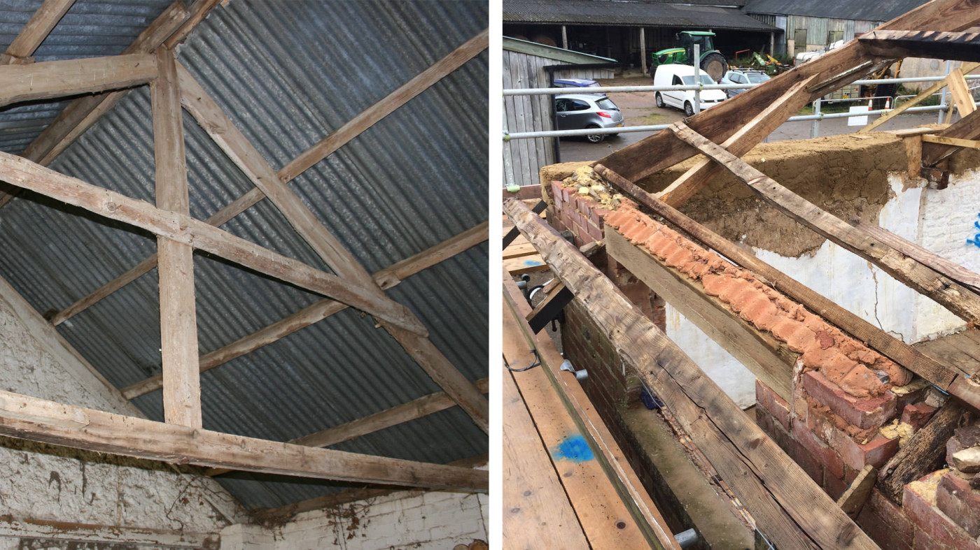 The barn had previously been used to house livestock, and several sections of the internal faces of the salt-rich cob wall had been licked by cows leading to dangerously thin lower wall sections. The walls were carefully propped and trimmed, with new cob repairs to reinstate full structural strength.