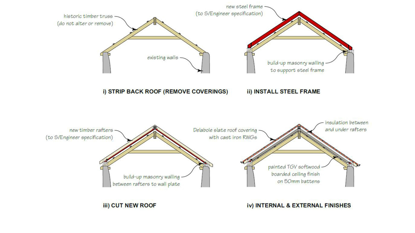Historic trussed rafters were not capable of taking the load of a new roof structure. A new steel structure was designed to ‘float’ over them, which was then concealed within the envelope of the ceilings and roof coverings. It was therefore possible to retain the original trusses without needing to heavily reinforce them with obtrusive steel supports.