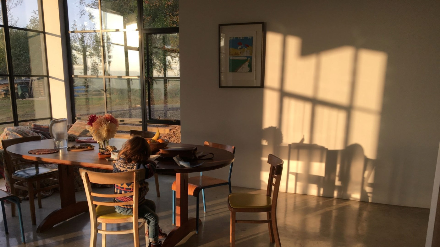 Thin profile detailing of the steel frame doors and windows give a modern feel. Internally power floated concrete floors and crisp painted plaster walls to the double height spaces contrast with the softer exposed ceiling joists and timber floorboards to the bedrooms.