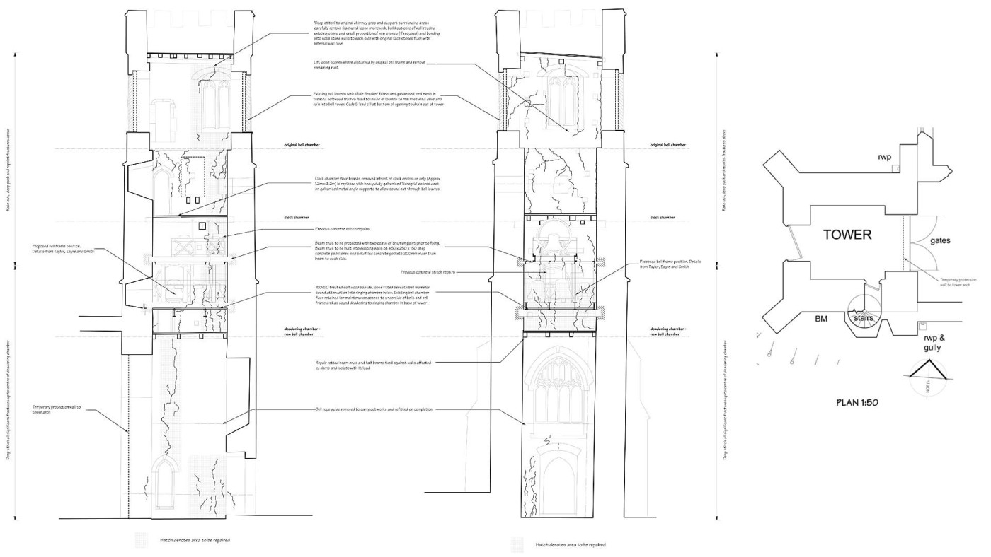 In conjunction with conservation engineer Paul Carpenter, who did some very thorough analysis of the impact of the bell frame at the lower level on the structure, we concluded that the bottom half of the tower up to the top of the bell frame, should be repaired pretty thoroughly, the cracking around the staircase and the chimney rebuilt with additional reinforcement. Above the bell frame, the chimney and staircase were repaired, but only the larger and more significant cracks cut out and stitched as is was not structurally necessary to repair all of the smaller cracks.