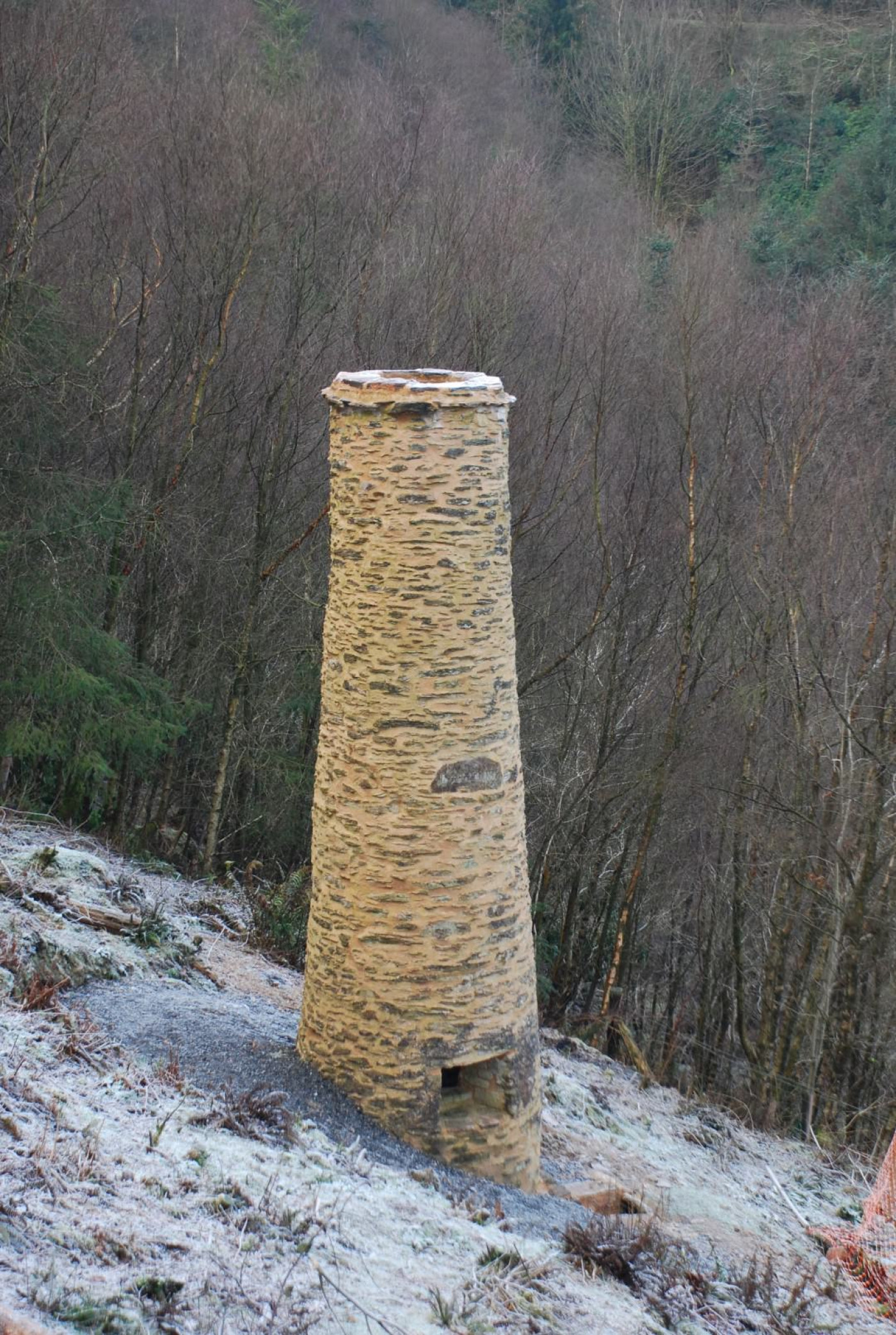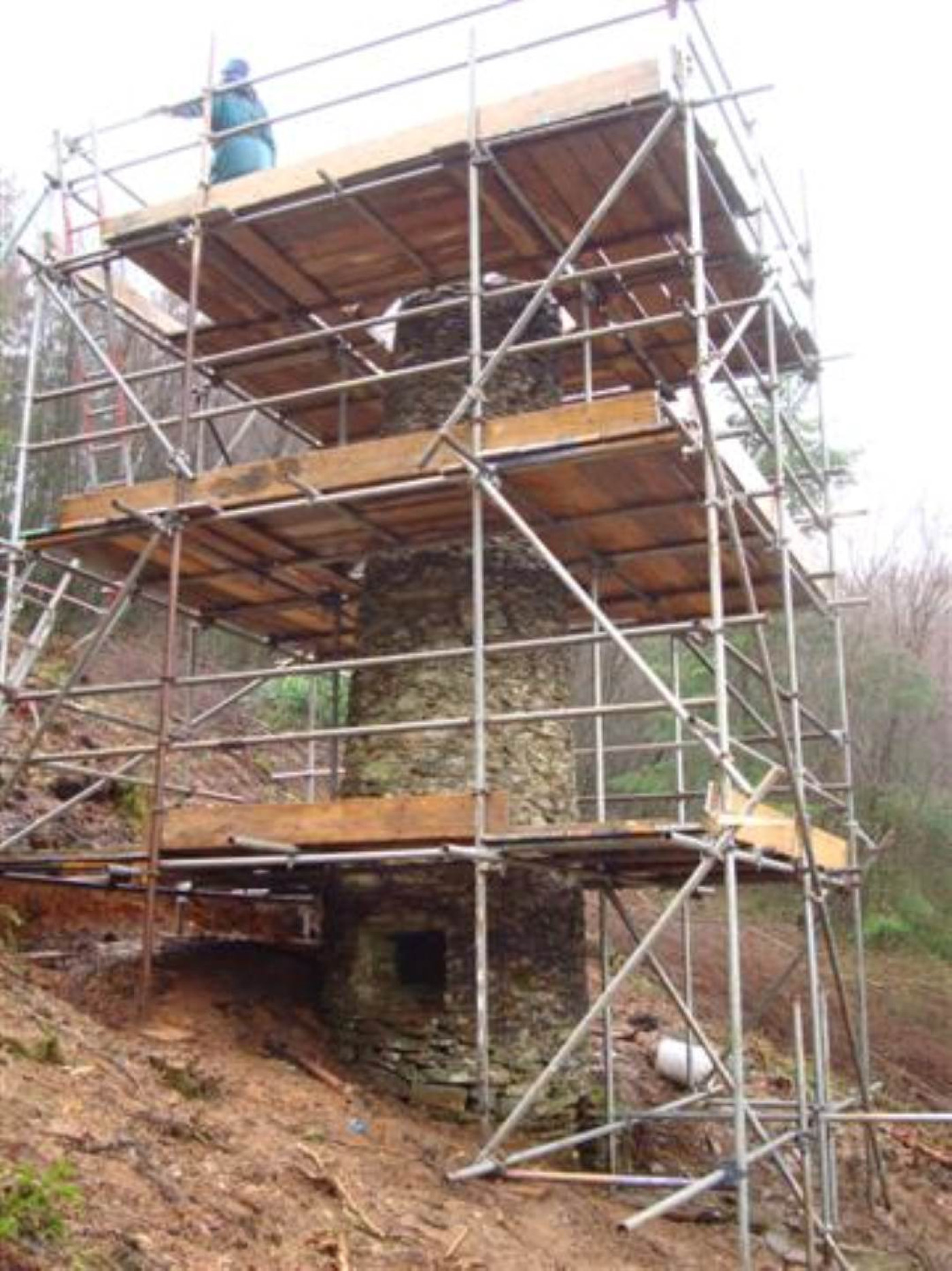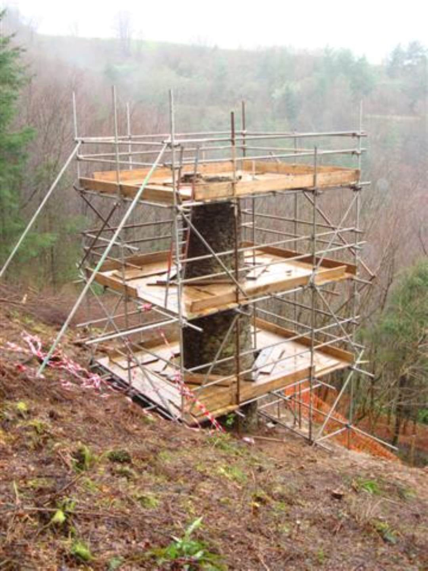 Jonathan Rhind Architects were appointed to stabilise, repair and conserve the chimney; a far from easy task given its isolated location on a steep slope amidst thick forestry land and the presence of a potentially unsafe, in-filled mine shaft on the hillside just below it. The work concluded in September 2008.