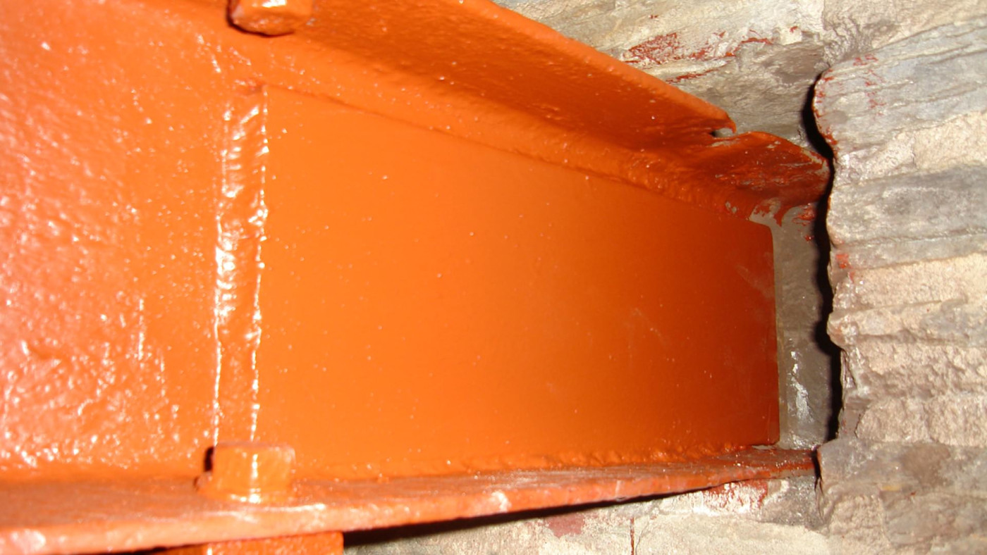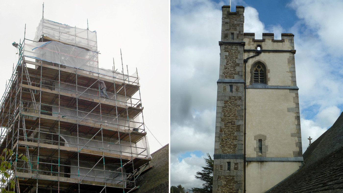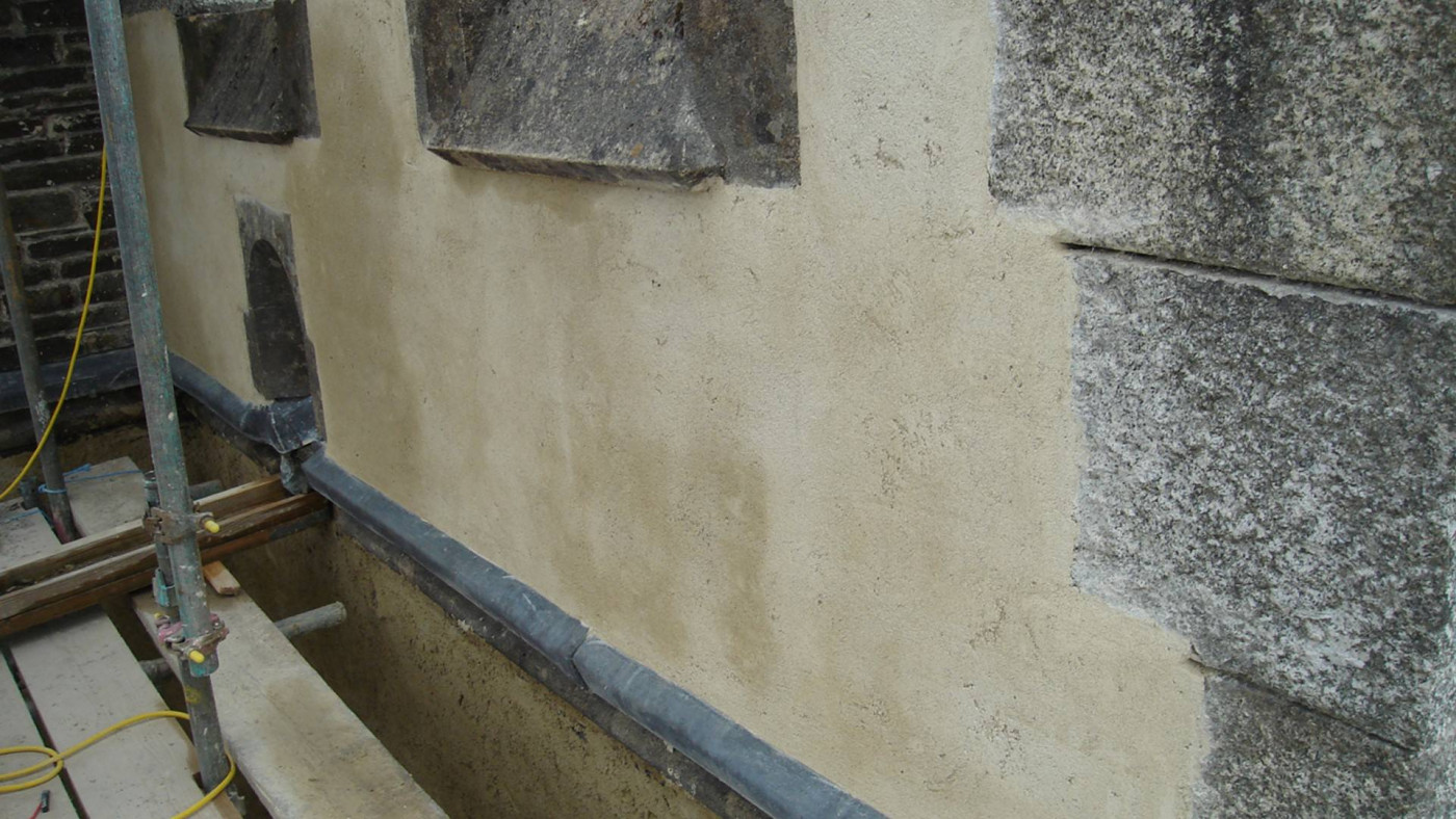 The existing, very tall chimney to the boiler flue built of rubble sandstone shaft with dressed granite cap was cracking and letting water in to the core of the wall and down in to the vestry.