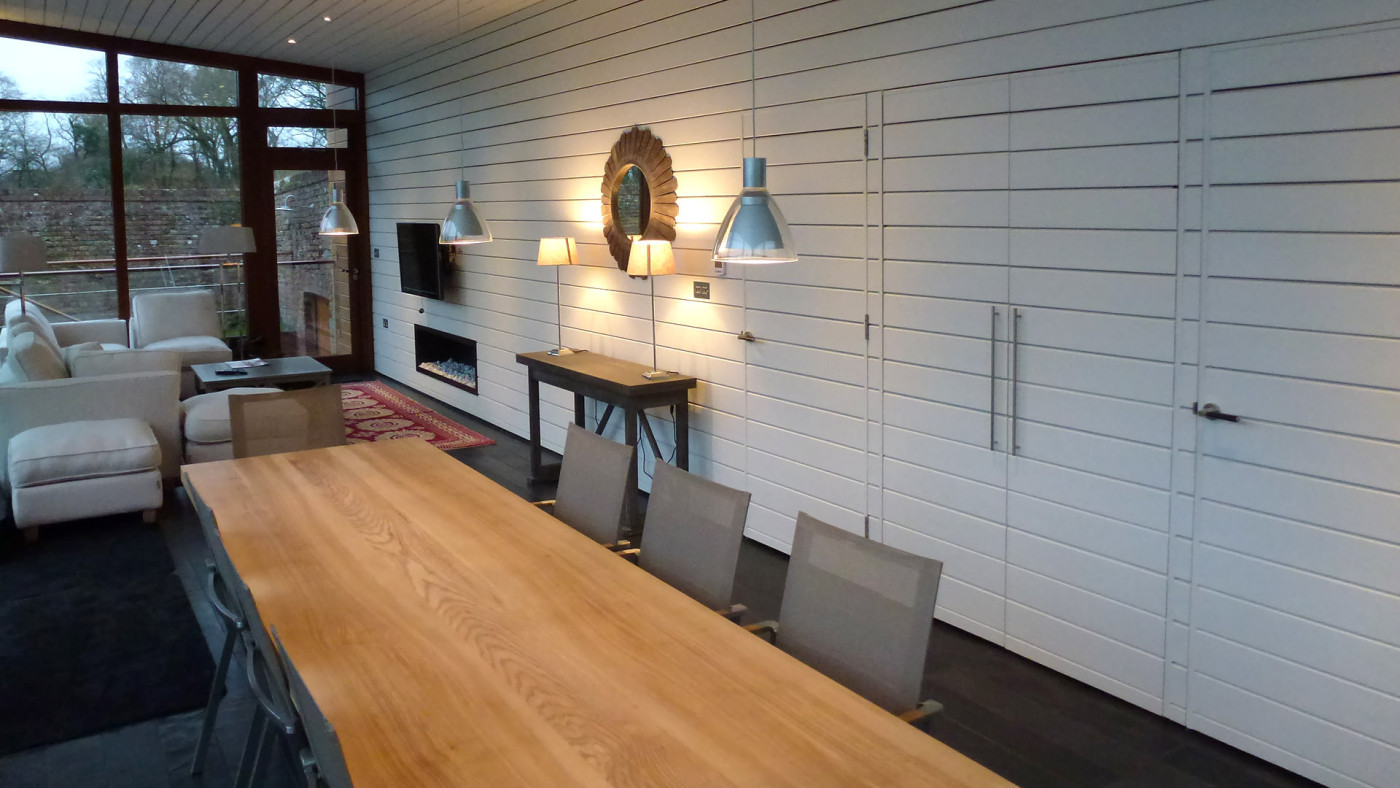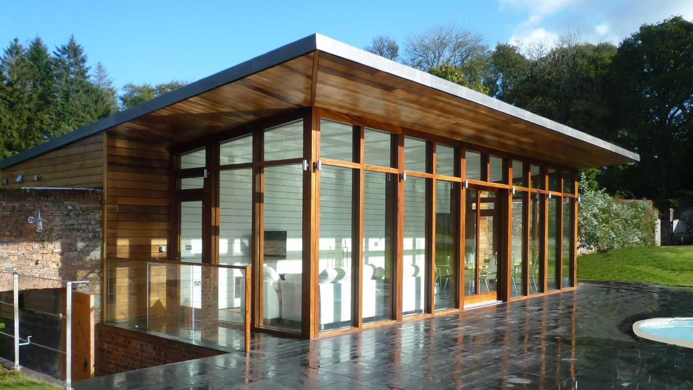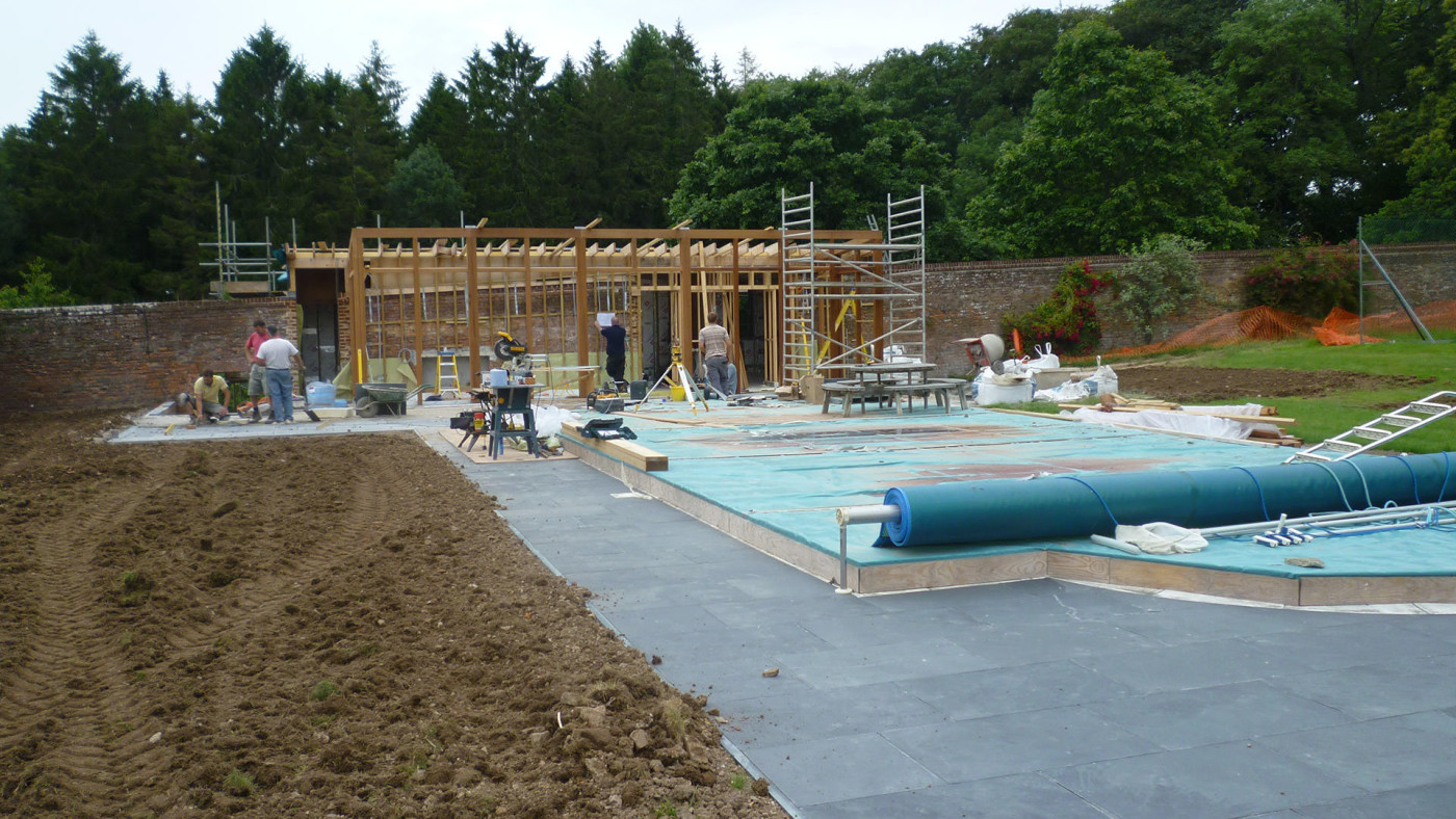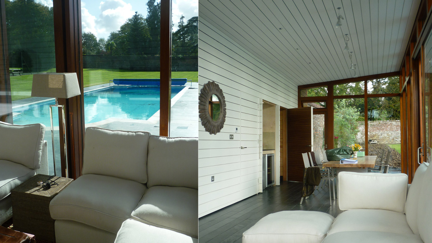 A new pool house in a listed walled garden with a simple, uncluttered sitting and eating space within the line of the wall and kitchen. The changing rooms etc. were constructed behind the wall. The striking, angled roof sails over the top of the wall, giving a generous internal height to the front area and the slate floor continues outside to form the pool terrace.