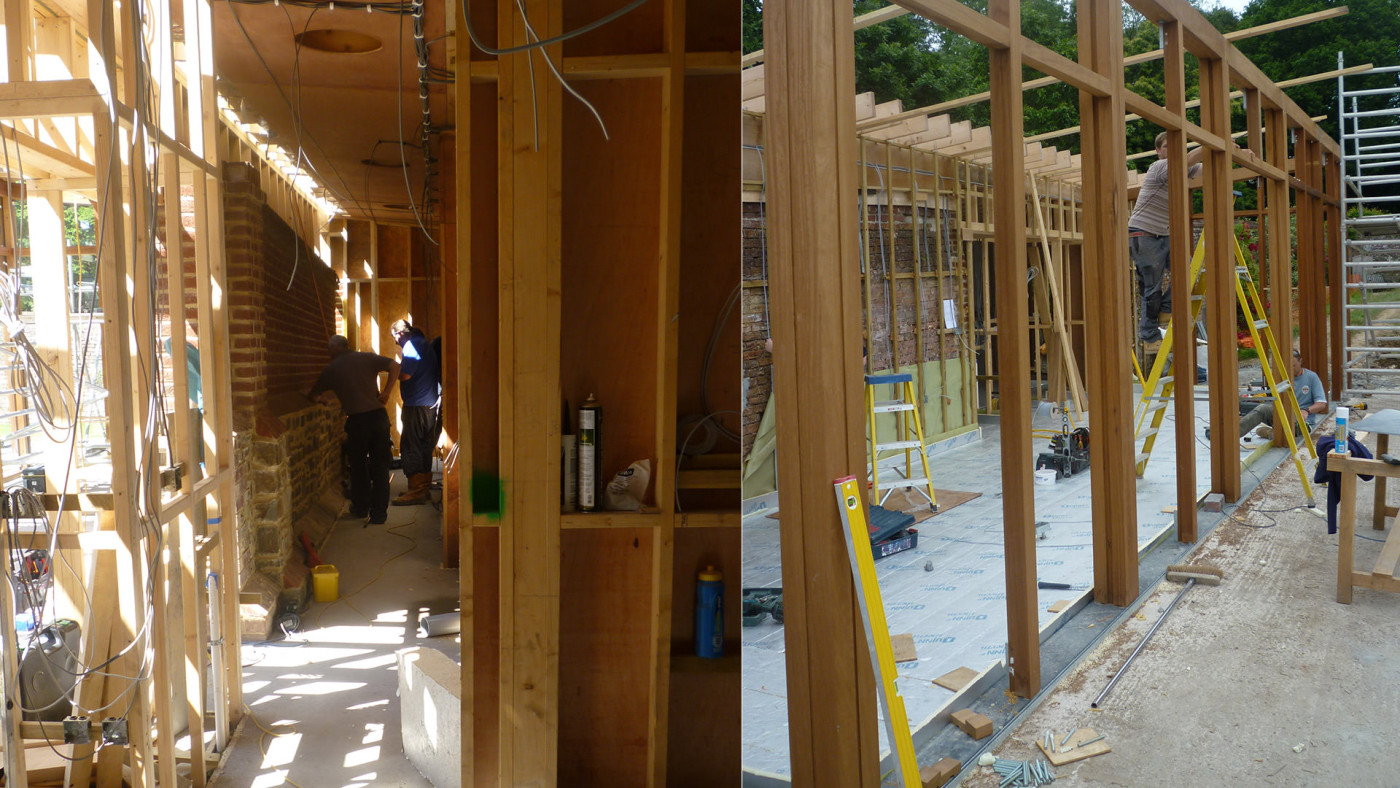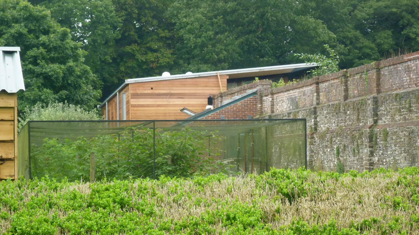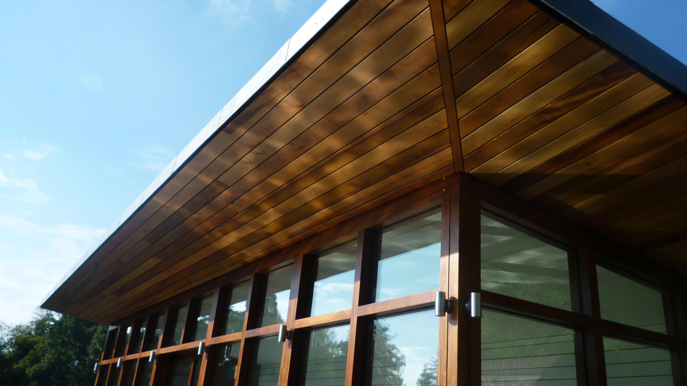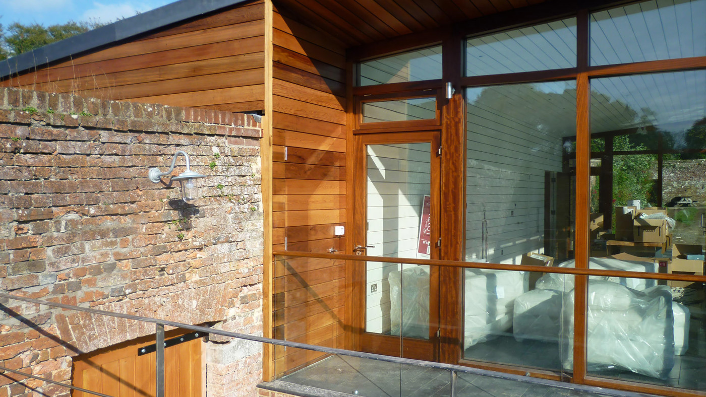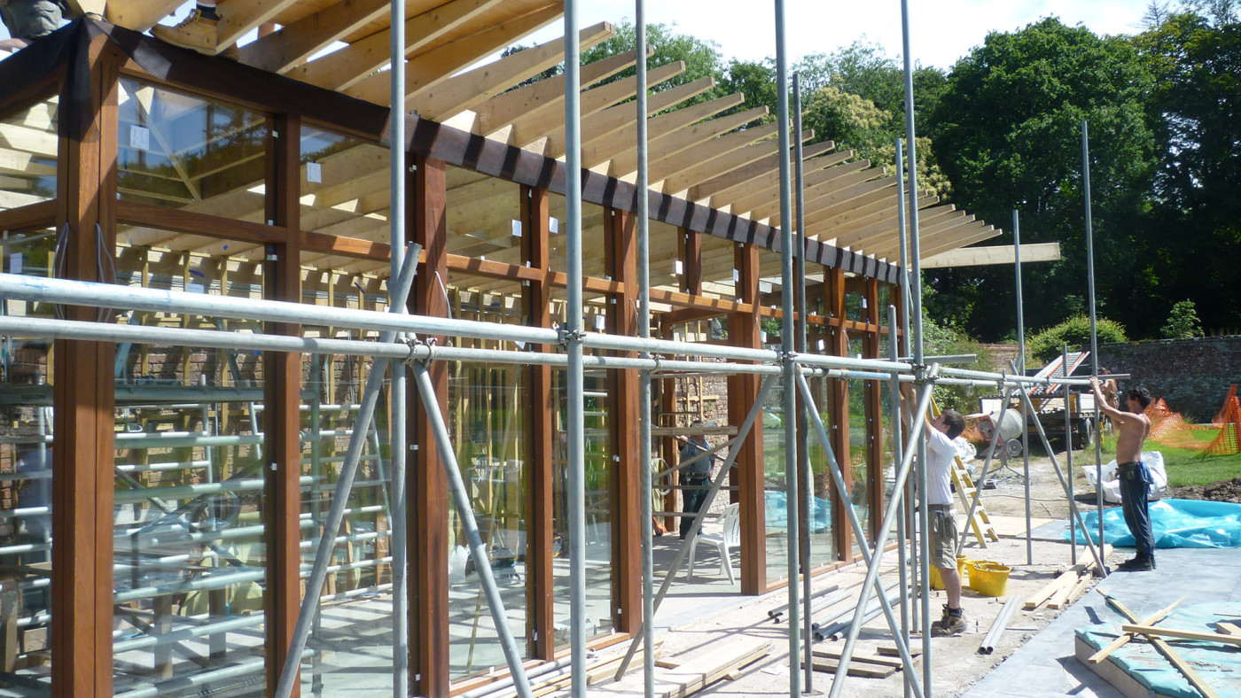A new pool house in a listed walled garden with a simple, uncluttered sitting and eating space within the line of the wall and kitchen. The changing rooms etc. were constructed behind the wall. The striking, angled roof sails over the top of the wall, giving a generous internal height to the front area and the slate floor continues outside to form the pool terrace.