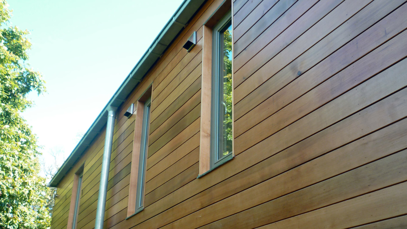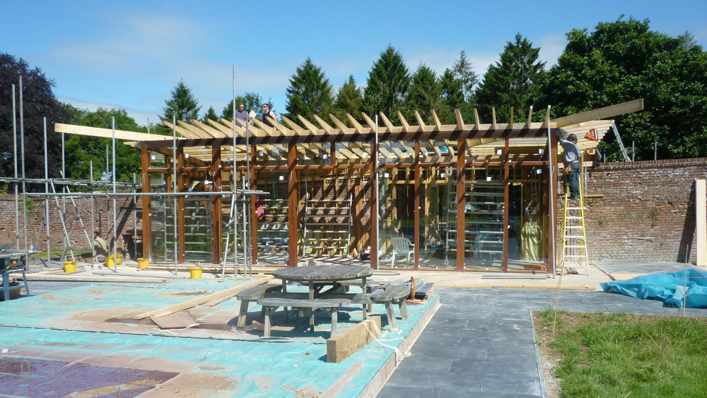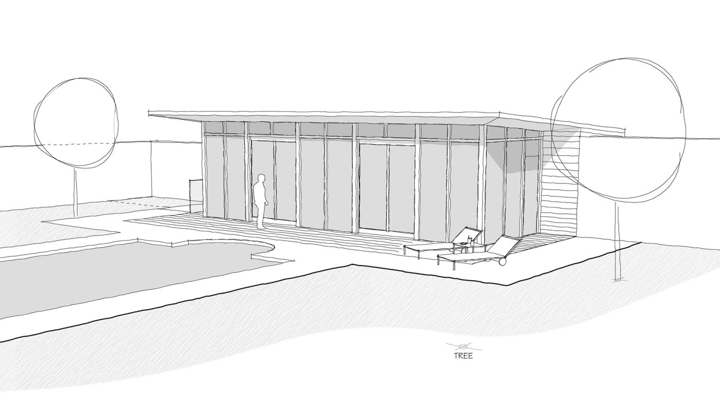 The building determines the formal areas of the garden in front of the pool and is a major element of the garden landscape.