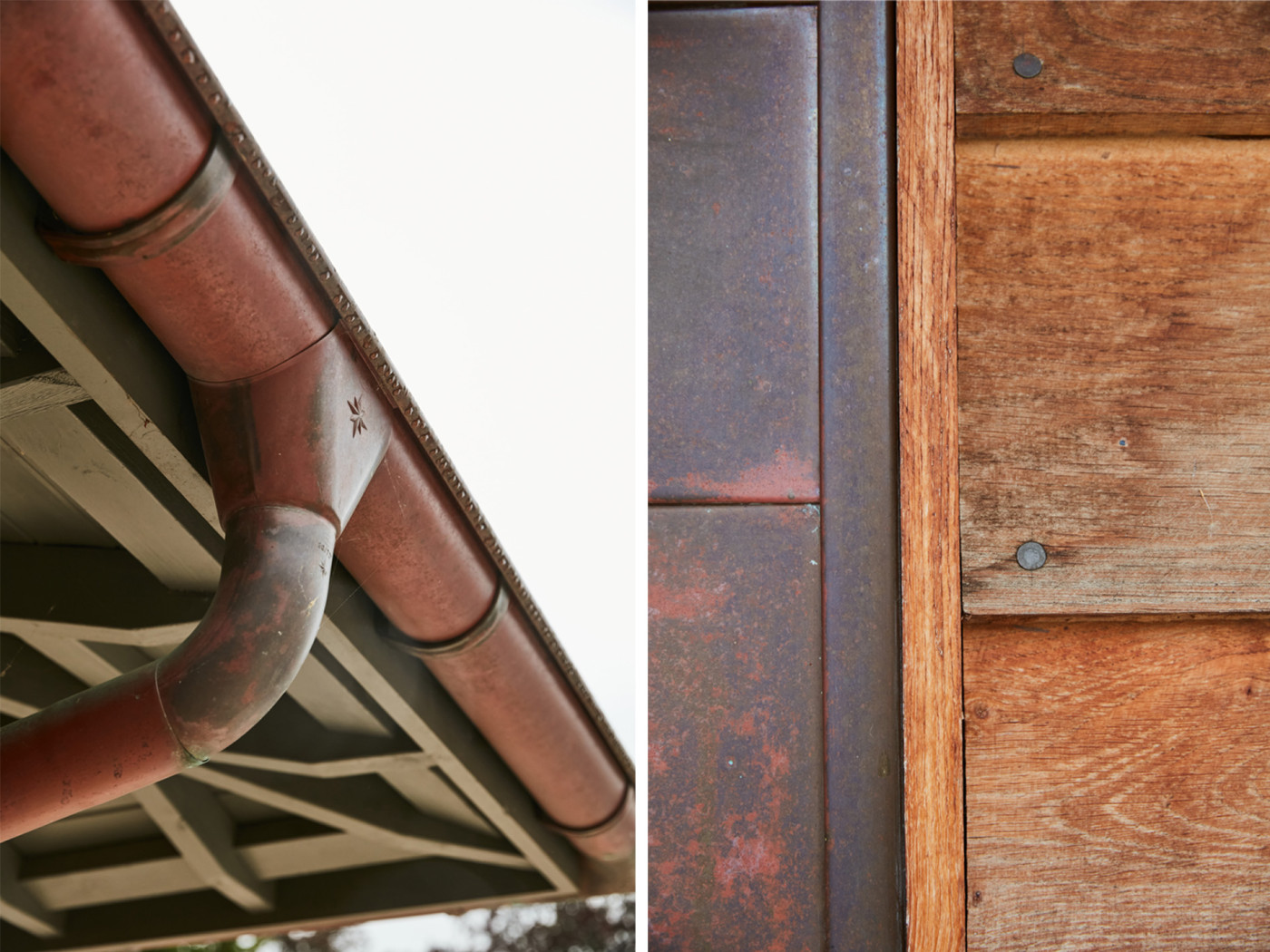 The clayey ground type and the open-plan form of the building indicated a steel frame on a concrete ring beam and piled foundations with masonry walls and oak external boarding, the deep overhangs to the ‘swept’ eaves give good shade and protection in sunshine.